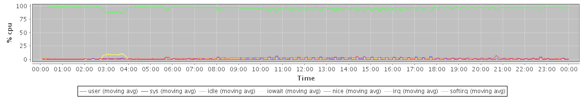 avg(user) = 2.09 avg(sys) = 0.77 avg(idle) = 96.16 avg(iowait) = 0.83 avg(nice) = 0.10 avg(irq) = 0.00 avg(softirq) = 0.04