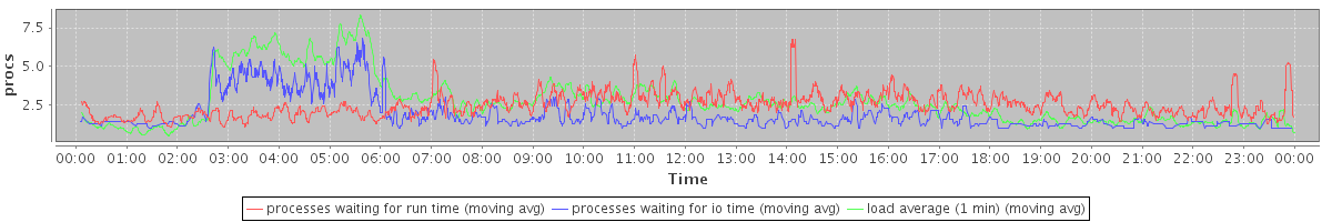 avg(processes waiting for run time) = 2.11 avg(processes waiting for io time) = 1.18 avg(load average (1 min)) = 2.72