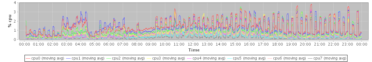avg(cpu0) = 0.19 avg(cpu1) = 0.23 avg(cpu2) = 0.08 avg(cpu3) = 0.08 avg(cpu4) = 0.06 avg(cpu5) = 0.05 avg(cpu6) = 0.04 avg(cpu7) = 0.05