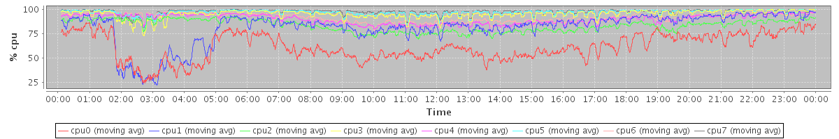 avg(cpu0) = 22.78 avg(cpu1) = 10.98 avg(cpu2) = 0.77 avg(cpu3) = 0.80 avg(cpu4) = 0.66 avg(cpu5) = 0.30 avg(cpu6) = 0.44 avg(cpu7) = 0.28