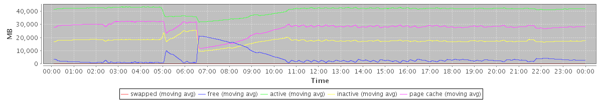 avg(swapped) = 56.38 avg(free) = 4128.80 avg(active) = 40735.89 avg(inactive) = 17414.17 avg(page cache) = 27384.52
