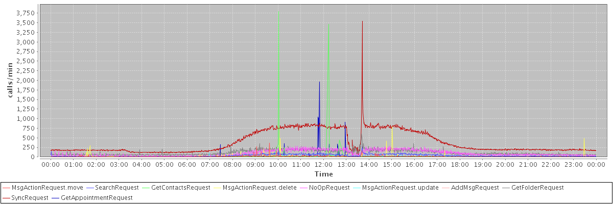 max(MsgActionRequest.move) = 357.00 max(SearchRequest) = 225.00 max(GetContactsRequest) = 3798.00 max(MsgActionRequest.delete) = 794.00 max(NoOpRequest) = 290.00 max(MsgActionRequest.update) = 167.00 max(AddMsgRequest) = 236.00 max(GetFolderRequest) = 609.00 max(SyncRequest) = 3548.00 max(GetAppointmentRequest) = 1957.00