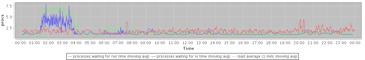 avg(processes waiting for run time) = 0.90 avg(processes waiting for io time) = 0.58 avg(load average (1 min)) = 1.72
