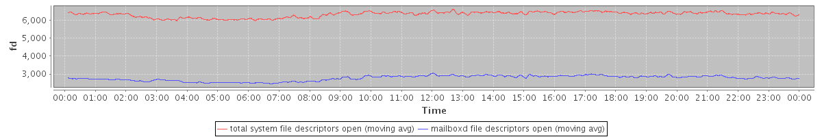 avg(total system file descriptors open) = 6326.08 avg(mailboxd file descriptors open) = 2766.35