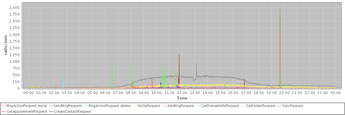 max(MsgActionRequest.move) = 2944.00 max(SendMsgRequest) = 145.00 max(MsgActionRequest.delete) = 3042.00 max(NoOpRequest) = 193.00 max(AddMsgRequest) = 188.00 max(GetDomainInfoRequest) = 438.00 max(GetFolderRequest) = 225.00 max(SyncRequest) = 945.00 max(GetAppointmentRequest) = 1260.00 max(CreateContactRequest) = 223.00