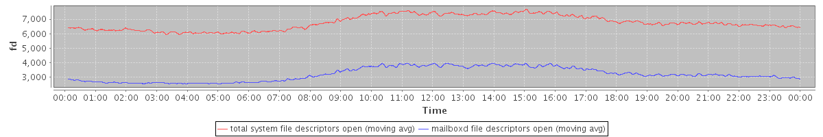avg(total system file descriptors open) = 6756.01 avg(mailboxd file descriptors open) = 3201.52