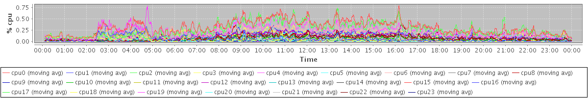 avg(cpu0) = 0.30 avg(cpu1) = 0.05 avg(cpu2) = 0.26 avg(cpu3) = 0.03 avg(cpu4) = 0.20 avg(cpu5) = 0.02 avg(cpu6) = 0.17 avg(cpu7) = 0.01 avg(cpu8) = 0.07 avg(cpu9) = 0.00 avg(cpu10) = 0.04 avg(cpu11) = 0.03 avg(cpu12) = 0.11 avg(cpu13) = 0.01 avg(cpu14) = 0.07 avg(cpu15) = 0.01 avg(cpu16) = 0.11 avg(cpu17) = 0.00 avg(cpu18) = 0.12 avg(cpu19) = 0.04 avg(cpu20) = 0.12 avg(cpu21) = 0.00 avg(cpu22) = 0.08 avg(cpu23) = 0.01