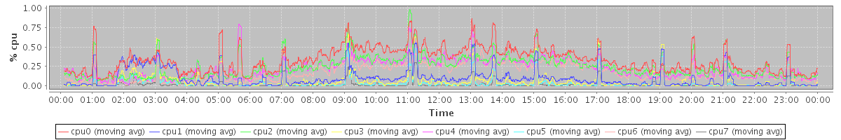 avg(cpu0) = 1.16 avg(cpu1) = 0.90 avg(cpu2) = 0.80 avg(cpu3) = 0.59 avg(cpu4) = 0.81 avg(cpu5) = 0.53 avg(cpu6) = 0.70 avg(cpu7) = 0.44