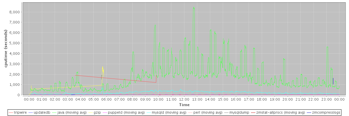 avg(tripwire) = 1677.67 avg(updatedb) = 28.06 avg(java) = 1676.21 avg(gzip) = 1962.50 avg(puppetd) = 15.78 avg(mysqld) = 232.78 avg(perl) = 12.83 avg(mysqldump) = 1786.43 avg(zmstat-allprocs) = 15.85 avg(zmcompresslogs) = 1334.50