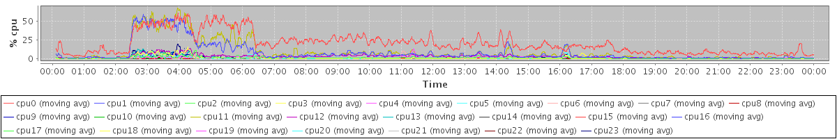 avg(cpu0) = 20.18 avg(cpu1) = 7.96 avg(cpu2) = 0.87 avg(cpu3) = 0.75 avg(cpu4) = 0.65 avg(cpu5) = 0.36 avg(cpu6) = 0.48 avg(cpu7) = 0.13 avg(cpu8) = 0.14 avg(cpu9) = 0.31 avg(cpu10) = 0.09 avg(cpu11) = 9.46 avg(cpu12) = 2.62 avg(cpu13) = 0.87 avg(cpu14) = 0.16 avg(cpu15) = 0.18 avg(cpu16) = 0.25 avg(cpu17) = 0.06 avg(cpu18) = 0.29 avg(cpu19) = 0.03 avg(cpu20) = 0.26 avg(cpu21) = 0.69 avg(cpu22) = 0.16 avg(cpu23) = 1.02