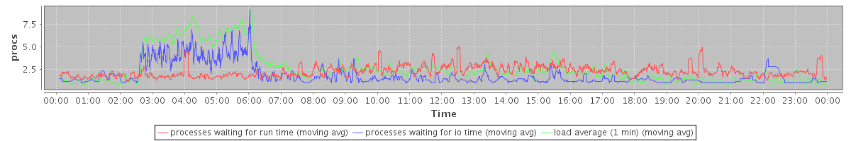 avg(processes waiting for run time) = 1.85 avg(processes waiting for io time) = 1.10 avg(load average (1 min)) = 2.59