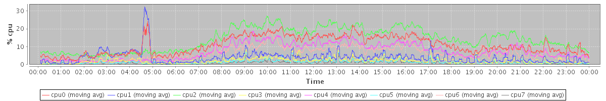 avg(cpu0) = 22.57 avg(cpu1) = 11.24 avg(cpu2) = 0.61 avg(cpu3) = 0.84 avg(cpu4) = 0.50 avg(cpu5) = 0.33 avg(cpu6) = 0.34 avg(cpu7) = 0.20