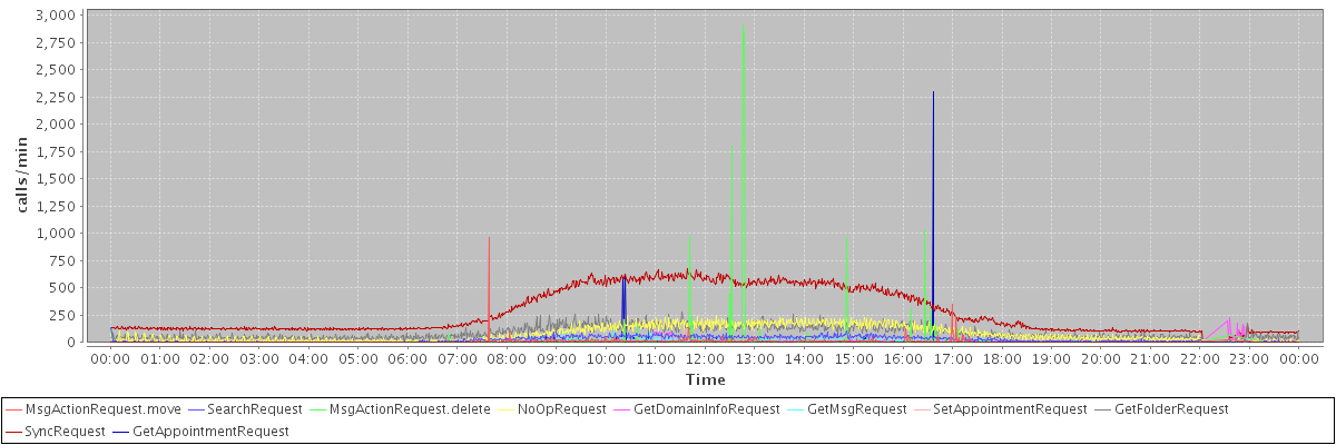 max(MsgActionRequest.move) = 958.00 max(SearchRequest) = 131.00 max(MsgActionRequest.delete) = 2913.00 max(NoOpRequest) = 245.00 max(GetDomainInfoRequest) = 228.00 max(GetMsgRequest) = 107.00 max(SetAppointmentRequest) = 124.00 max(GetFolderRequest) = 276.00 max(SyncRequest) = 673.00 max(GetAppointmentRequest) = 2302.00