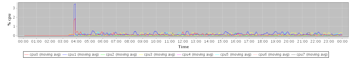 avg(cpu0) = 0.10 avg(cpu1) = 0.01 avg(cpu2) = 0.05 avg(cpu3) = 0.03 avg(cpu4) = 0.05 avg(cpu5) = 0.01 avg(cpu6) = 0.01 avg(cpu7) = 0.00