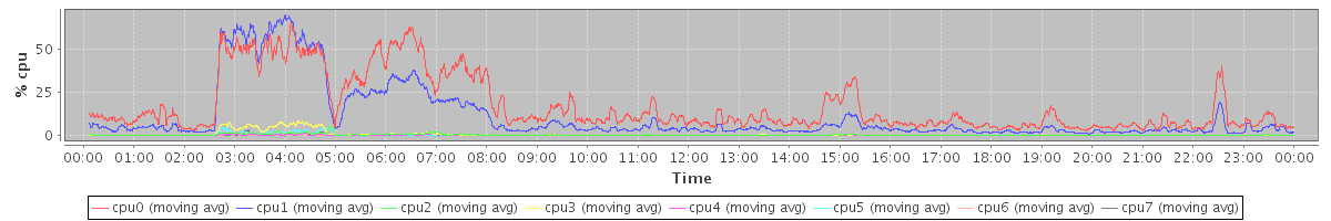 avg(cpu0) = 16.94 avg(cpu1) = 11.02 avg(cpu2) = 0.25 avg(cpu3) = 0.60 avg(cpu4) = 0.09 avg(cpu5) = 0.22 avg(cpu6) = 0.08 avg(cpu7) = 0.13