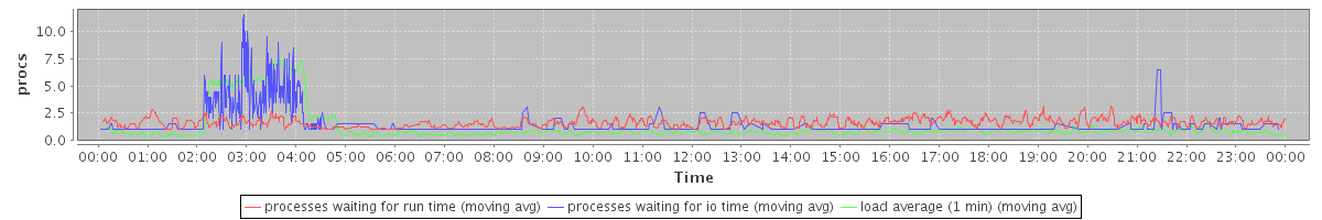 avg(processes waiting for run time) = 0.86 avg(processes waiting for io time) = 0.49 avg(load average (1 min)) = 1.24