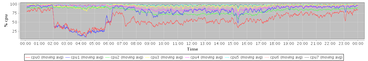 avg(cpu0) = 28.98 avg(cpu1) = 18.12 avg(cpu2) = 1.15 avg(cpu3) = 1.35 avg(cpu4) = 1.01 avg(cpu5) = 0.43 avg(cpu6) = 0.39 avg(cpu7) = 0.44
