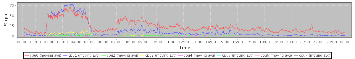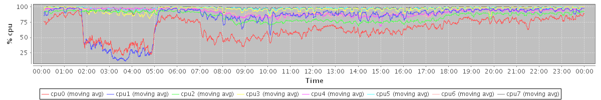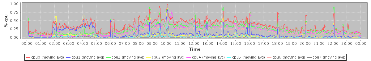 avg(cpu0) = 1.24 avg(cpu1) = 0.96 avg(cpu2) = 0.78 avg(cpu3) = 0.64 avg(cpu4) = 0.79 avg(cpu5) = 0.51 avg(cpu6) = 0.71 avg(cpu7) = 0.49