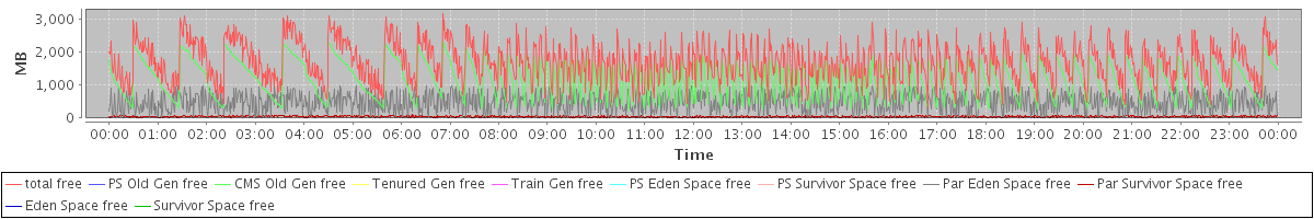 avg(total free) = 1689.77 avg(PS Old Gen free) = 0.00 avg(CMS Old Gen free) = 1157.46 avg(Tenured Gen free) = 0.00 avg(Train Gen free) = 0.00 avg(PS Eden Space free) = 0.00 avg(PS Survivor Space free) = 0.00 avg(Par Eden Space free) = 488.62 avg(Par Survivor Space free) = 43.69 avg(Eden Space free) = 0.00 avg(Survivor Space free) = 0.00