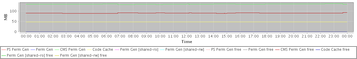 avg(PS Perm Gen) = 0.00 avg(Perm Gen) = 0.00 avg(CMS Perm Gen) = 132.79 avg(Code Cache) = 47.51 avg(Perm Gen [shared-ro]) = 0.00 avg(Perm Gen [shared-rw]) = 0.00 avg(PS Perm Gen free) = 0.00 avg(Perm Gen free) = 0.00 avg(CMS Perm Gen free) = 89.72 avg(Code Cache free) = 0.30 avg(Perm Gen [shared-ro] free) = 0.00 avg(Perm Gen [shared-rw] free) = 0.00
