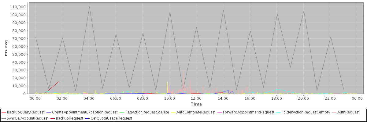 avg(BackupQueryRequest) = 492.50 avg(CreateAppointmentExceptionRequest) = 472.04 avg(TagActionRequest.delete) = 546.00 avg(AutoCompleteRequest) = 345.17 avg(ForwardAppointmentRequest) = 889.00 avg(FolderActionRequest.empty) = 795.60 avg(AuthRequest) = 316.55 avg(SyncGalAccountRequest) = 48143.54 avg(BackupRequest) = 8450.00 avg(GetQuotaUsageRequest) = 1418.00