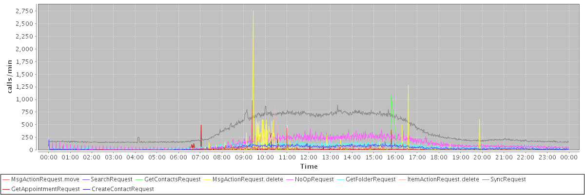 max(MsgActionRequest.move) = 975.00 max(SearchRequest) = 202.00 max(GetContactsRequest) = 1075.00 max(MsgActionRequest.delete) = 2751.00 max(NoOpRequest) = 418.00 max(GetFolderRequest) = 203.00 max(ItemActionRequest.delete) = 876.00 max(SyncRequest) = 892.00 max(GetAppointmentRequest) = 499.00 max(CreateContactRequest) = 168.00