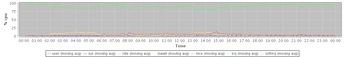 avg(user) = 4.73 avg(sys) = 0.84 avg(idle) = 90.13 avg(iowait) = 4.08 avg(nice) = 0.10 avg(irq) = 0.00 avg(softirq) = 0.14