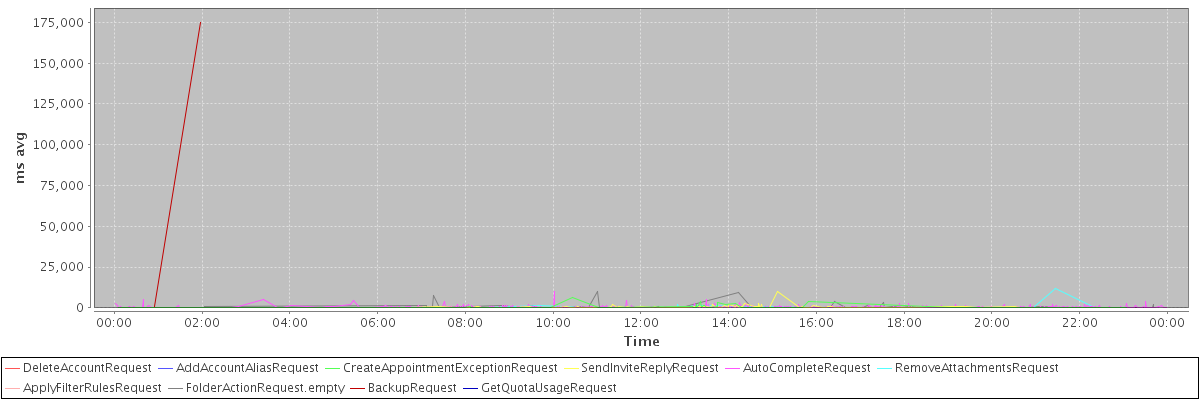 avg(DeleteAccountRequest) = 22307.00 avg(AddAccountAliasRequest) = 639.00 avg(CreateAppointmentExceptionRequest) = 833.23 avg(SendInviteReplyRequest) = 679.60 avg(AutoCompleteRequest) = 460.61 avg(RemoveAttachmentsRequest) = 1046.73 avg(ApplyFilterRulesRequest) = 3372.00 avg(FolderActionRequest.empty) = 889.97 avg(BackupRequest) = 88034.00 avg(GetQuotaUsageRequest) = 2237.00