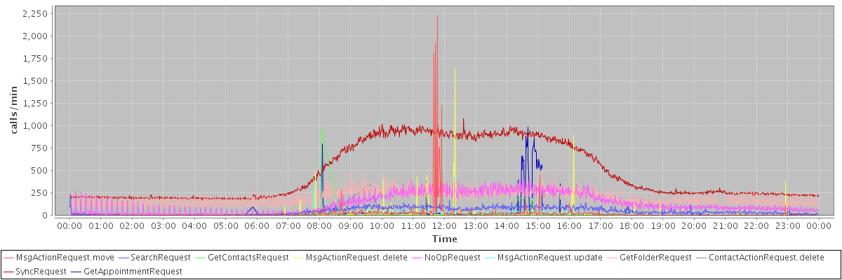 max(MsgActionRequest.move) = 2232.00 max(SearchRequest) = 235.00 max(GetContactsRequest) = 970.00 max(MsgActionRequest.delete) = 1633.00 max(NoOpRequest) = 424.00 max(MsgActionRequest.update) = 295.00 max(GetFolderRequest) = 518.00 max(ContactActionRequest.delete) = 349.00 max(SyncRequest) = 1079.00 max(GetAppointmentRequest) = 984.00