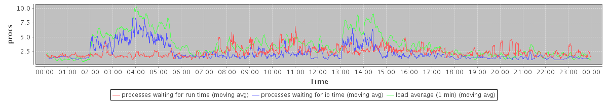 avg(processes waiting for run time) = 1.80 avg(processes waiting for io time) = 1.60 avg(load average (1 min)) = 3.53