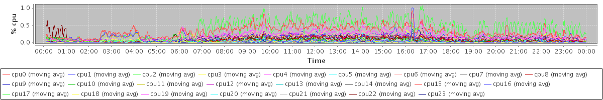 avg(cpu0) = 0.16 avg(cpu1) = 0.08 avg(cpu2) = 0.08 avg(cpu3) = 0.04 avg(cpu4) = 0.05 avg(cpu5) = 0.03 avg(cpu6) = 0.05 avg(cpu7) = 0.03 avg(cpu8) = 0.04 avg(cpu9) = 0.01 avg(cpu10) = 0.05 avg(cpu11) = 0.04 avg(cpu12) = 0.06 avg(cpu13) = 0.02 avg(cpu14) = 0.08 avg(cpu15) = 0.04 avg(cpu16) = 0.04 avg(cpu17) = 0.06 avg(cpu18) = 0.38 avg(cpu19) = 0.10 avg(cpu20) = 0.22 avg(cpu21) = 0.13 avg(cpu22) = 0.10 avg(cpu23) = 0.07