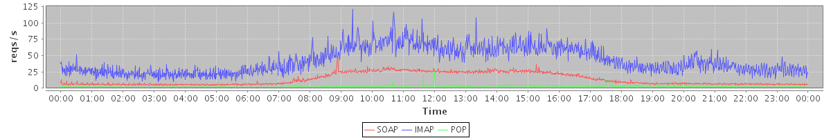 Host zm02.stanford.edu: Mailboxd: Request Rate by Client Protocol