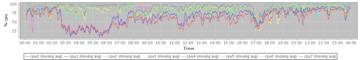 avg(cpu0) = 59.17 avg(cpu1) = 66.12 avg(cpu2) = 86.10 avg(cpu3) = 84.56 avg(cpu4) = 88.88 avg(cpu5) = 88.67 avg(cpu6) = 90.46 avg(cpu7) = 90.91