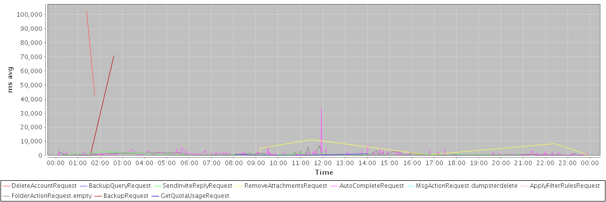 avg(DeleteAccountRequest) = 72638.50 avg(BackupQueryRequest) = 442.50 avg(SendInviteReplyRequest) = 504.03 avg(RemoveAttachmentsRequest) = 3114.22 avg(AutoCompleteRequest) = 649.26 avg(MsgActionRequest.dumpsterdelete) = 568.00 avg(ApplyFilterRulesRequest) = 8010.00 avg(FolderActionRequest.empty) = 691.52 avg(BackupRequest) = 35868.50 avg(GetQuotaUsageRequest) = 1384.00