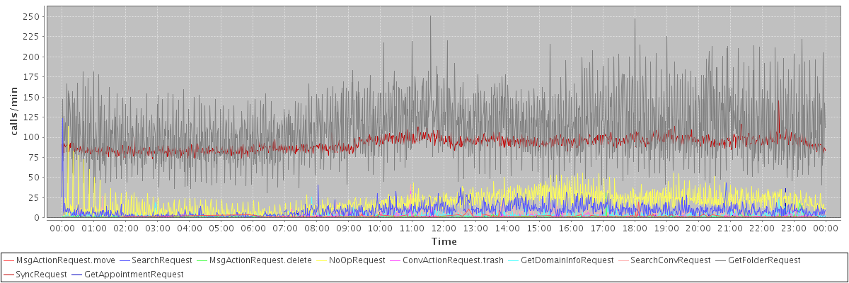 max(MsgActionRequest.move) = 20.00 max(SearchRequest) = 123.00 max(MsgActionRequest.delete) = 31.00 max(NoOpRequest) = 114.00 max(ConvActionRequest.trash) = 33.00 max(GetDomainInfoRequest) = 41.00 max(SearchConvRequest) = 42.00 max(GetFolderRequest) = 251.00 max(SyncRequest) = 145.00 max(GetAppointmentRequest) = 36.00