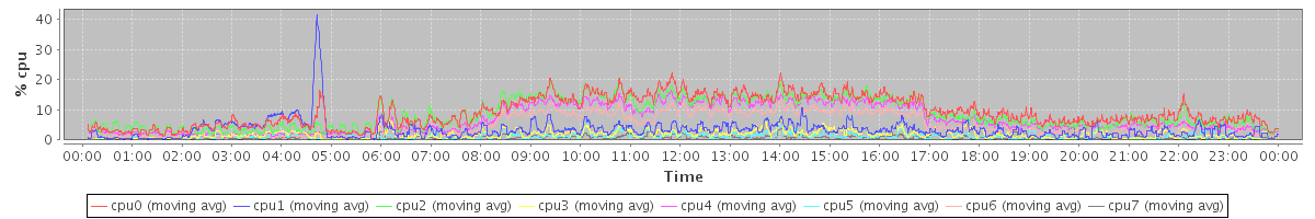 avg(cpu0) = 15.05 avg(cpu1) = 8.57 avg(cpu2) = 0.65 avg(cpu3) = 0.60 avg(cpu4) = 0.38 avg(cpu5) = 0.23 avg(cpu6) = 0.15 avg(cpu7) = 0.12