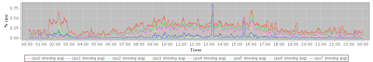 avg(cpu0) = 13.84 avg(cpu1) = 0.63 avg(cpu2) = 0.55 avg(cpu3) = 0.31 avg(cpu4) = 0.32 avg(cpu5) = 0.18 avg(cpu6) = 0.13 avg(cpu7) = 0.05