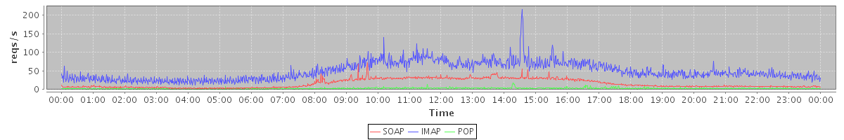 Host zm02.stanford.edu: Mailboxd: Request Rate by Client Protocol