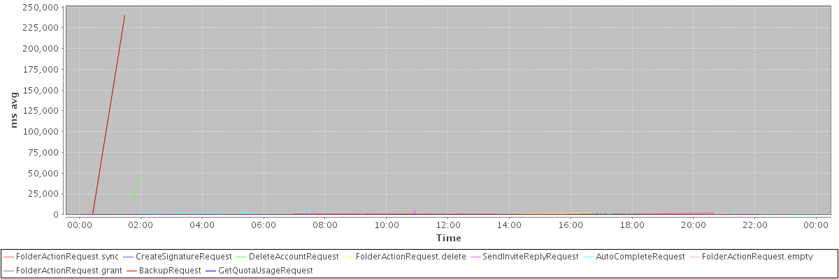 avg(FolderActionRequest.sync) = 1145.33 avg(CreateSignatureRequest) = 429.33 avg(DeleteAccountRequest) = 28235.33 avg(FolderActionRequest.delete) = 1184.00 avg(SendInviteReplyRequest) = 447.83 avg(AutoCompleteRequest) = 376.58 avg(FolderActionRequest.empty) = 601.76 avg(FolderActionRequest.grant) = 459.60 avg(BackupRequest) = 119972.50 avg(GetQuotaUsageRequest) = 4356.00