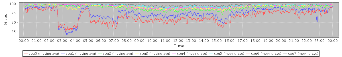avg(cpu0) = 19.19 avg(cpu1) = 12.74 avg(cpu2) = 0.91 avg(cpu3) = 1.08 avg(cpu4) = 0.50 avg(cpu5) = 0.34 avg(cpu6) = 0.61 avg(cpu7) = 0.16