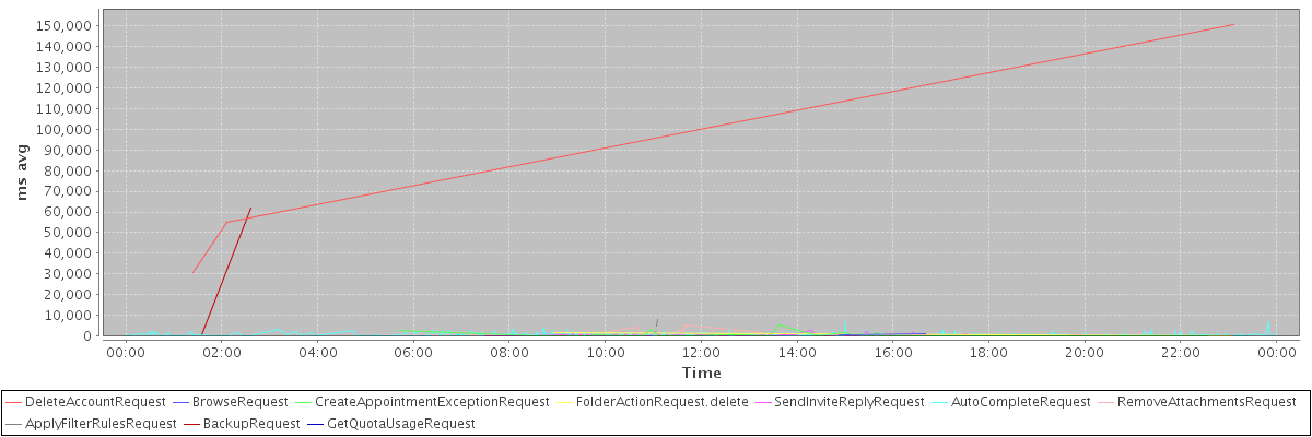 avg(DeleteAccountRequest) = 78671.00 avg(BrowseRequest) = 1093.50 avg(CreateAppointmentExceptionRequest) = 620.50 avg(FolderActionRequest.delete) = 874.00 avg(SendInviteReplyRequest) = 566.91 avg(AutoCompleteRequest) = 565.81 avg(RemoveAttachmentsRequest) = 976.20 avg(ApplyFilterRulesRequest) = 6392.00 avg(BackupRequest) = 31419.00 avg(GetQuotaUsageRequest) = 1470.00