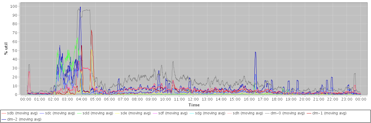 avg(sdb) = 5.62 avg(sdc) = 3.69 avg(sdd) = 3.36 avg(sde) = 1.26 avg(sdf) = 5.65 avg(sdg) = 3.68 avg(sdh) = 3.37 avg(dm-0) = 15.18 avg(dm-1) = 3.23 avg(dm-2) = 7.79
