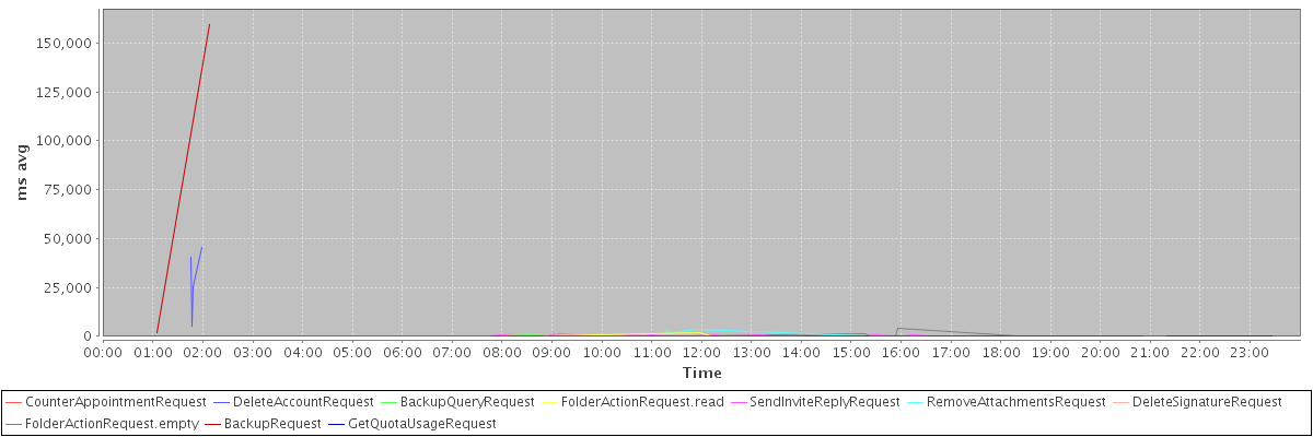 avg(CounterAppointmentRequest) = 788.00 avg(DeleteAccountRequest) = 29103.00 avg(BackupQueryRequest) = 442.20 avg(FolderActionRequest.read) = 552.67 avg(SendInviteReplyRequest) = 416.56 avg(RemoveAttachmentsRequest) = 1950.11 avg(DeleteSignatureRequest) = 487.33 avg(FolderActionRequest.empty) = 625.42 avg(BackupRequest) = 80687.50 avg(GetQuotaUsageRequest) = 2833.00