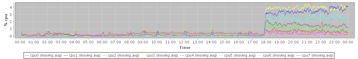 avg(cpu0) = 18.75 avg(cpu1) = 10.74 avg(cpu2) = 0.99 avg(cpu3) = 0.83 avg(cpu4) = 0.86 avg(cpu5) = 0.35 avg(cpu6) = 0.62 avg(cpu7) = 0.18