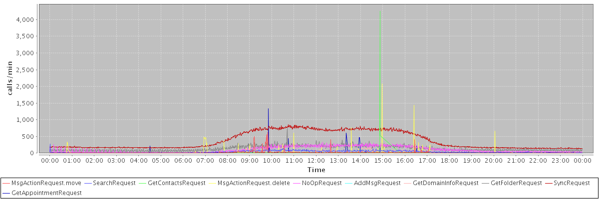 max(MsgActionRequest.move) = 630.00 max(SearchRequest) = 274.00 max(GetContactsRequest) = 4256.00 max(MsgActionRequest.delete) = 2071.00 max(NoOpRequest) = 326.00 max(AddMsgRequest) = 260.00 max(GetDomainInfoRequest) = 166.00 max(GetFolderRequest) = 733.00 max(SyncRequest) = 849.00 max(GetAppointmentRequest) = 1329.00