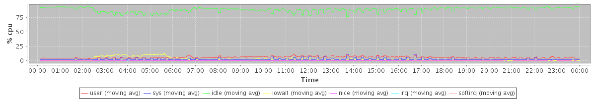 avg(user) = 5.66 avg(sys) = 2.36 avg(idle) = 89.31 avg(iowait) = 2.51 avg(nice) = 0.10 avg(irq) = 0.00 avg(softirq) = 0.07