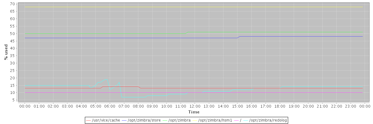 avg(/usr/vice/cache) = 13.11 avg(/opt/zimbra/store) = 47.37 avg(/opt/zimbra) = 50.52 avg(/opt/zimbra/hsm1) = 68.00 avg(/) = 10.00 avg(/opt/zimbra/redolog) = 12.50
