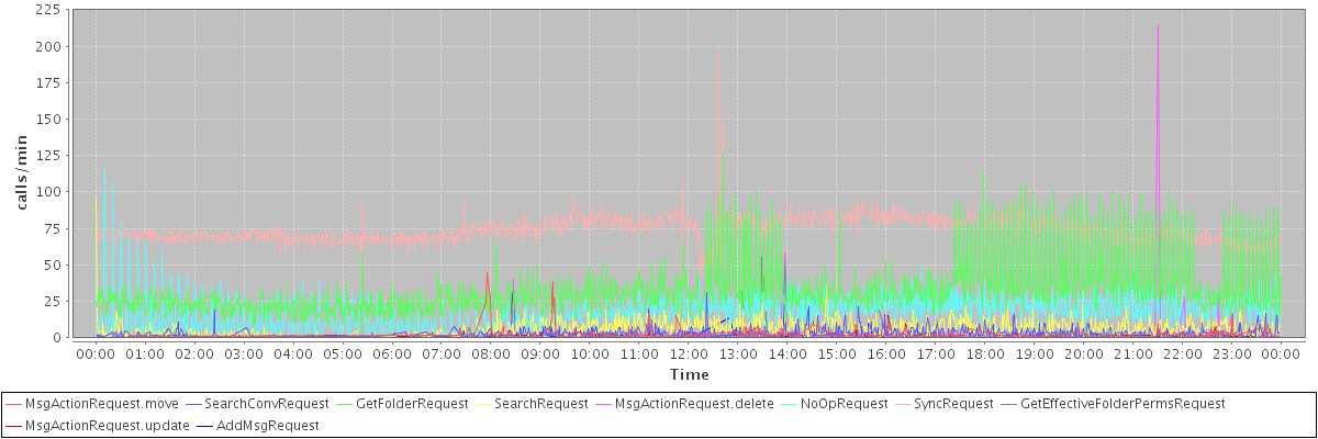 max(MsgActionRequest.move) = 45.00 max(SearchConvRequest) = 31.00 max(GetFolderRequest) = 125.00 max(SearchRequest) = 96.00 max(MsgActionRequest.delete) = 215.00 max(NoOpRequest) = 117.00 max(SyncRequest) = 199.00 max(GetEffectiveFolderPermsRequest) = 56.00 max(MsgActionRequest.update) = 39.00 max(AddMsgRequest) = 56.00