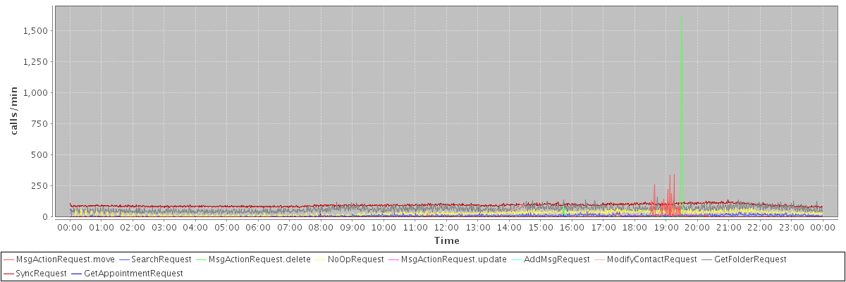 max(MsgActionRequest.move) = 343.00 max(SearchRequest) = 63.00 max(MsgActionRequest.delete) = 1623.00 max(NoOpRequest) = 77.00 max(MsgActionRequest.update) = 40.00 max(AddMsgRequest) = 85.00 max(ModifyContactRequest) = 135.00 max(GetFolderRequest) = 162.00 max(SyncRequest) = 139.00 max(GetAppointmentRequest) = 66.00
