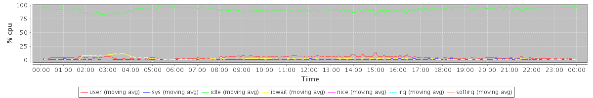 avg(user) = 4.46 avg(sys) = 0.75 avg(idle) = 92.13 avg(iowait) = 2.38 avg(nice) = 0.10 avg(irq) = 0.00 avg(softirq) = 0.19